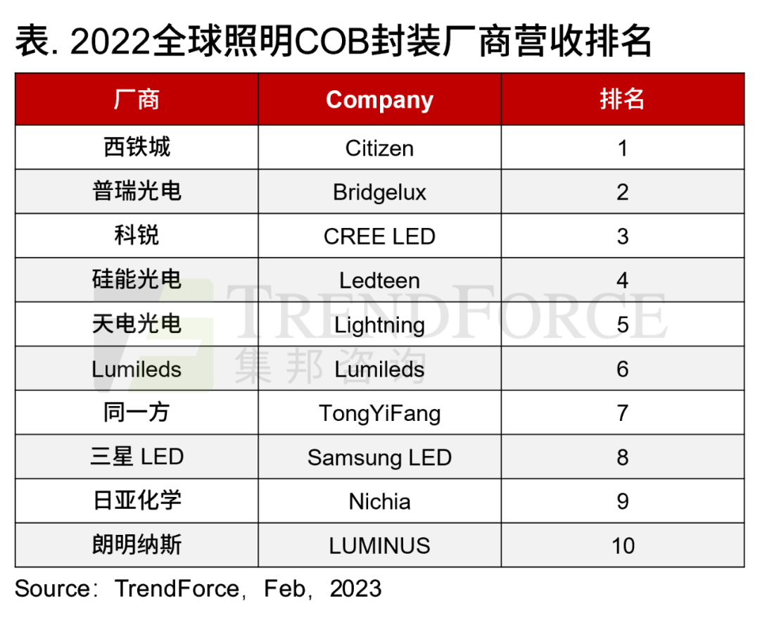 CREE是不斷耕耘照明市場,主推主推大功率和COB產(chǎn)品,產(chǎn)品廣泛應用于路燈、隧道燈及其他戶外大功率照明產(chǎn)品。2022年受商業(yè)照明市場需求下滑的影響,CREE COB封裝業(yè)務亦受到?jīng)_擊,不過依舊排名第三。